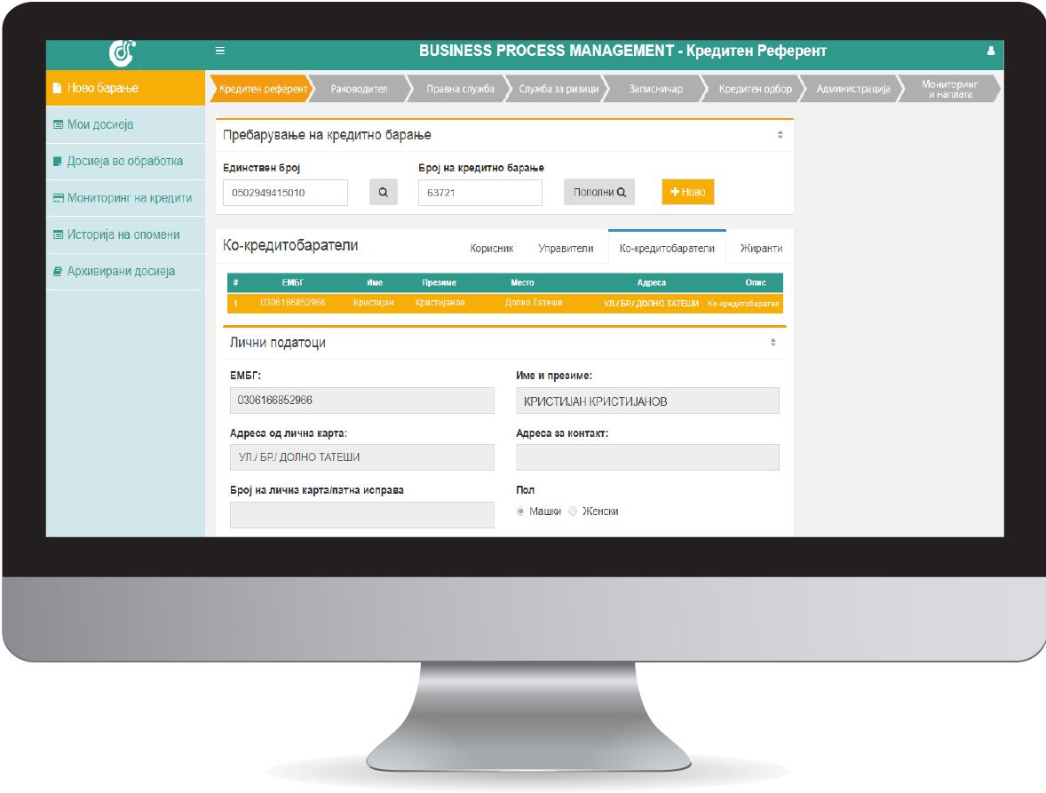 A detailed overview of the borrower, managers, co-borrower and guarantors which are connectedto the loan application. The system enables storing of personal and financial information.